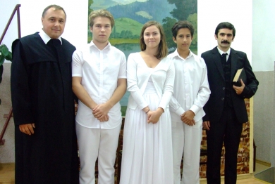 Isten kegyelméből 2015 október 11-én bemerítést tartott a Berettyószéplak-i gyülekezet. Áldott örömünnep volt, mikor há-rom fiatal fehérruhás tett bizonyságot Jézusról, mint személyes megváltójáról, és csatlakozott a helyi gyülekezethez. Az alkalom bevezetésében i-mára buzdítottak ifj. Bereczki Zoltán (Jer 29:11), és Szabó Béla (Zsolt 118:23-24 valamint Fil 3:13-14) versek alapján. Igét hirdetett Kiss Lehel szamosújvári lelkipásztor. A bemerítést a helybeli lelkipásztor, Fekete Csaba végezte. Nagyon felemelő volt a közös éneklés és dicsőítés, amelyet ifj. Bereczki Zoltán tv. vezetett Pécelről. A lelkipásztor és a fehérruhások nevei balról jobbra: Fekete Csaba lp., Zmole Maximilian, Zmole Patricia, Szabó Ruben és Kiss Lehel lp. Az Úr tartsa meg a frissen bemerítetteket az ő kegyelméből. A délutáni alkalmon Isten elvett áldásaiért adtunk hálát a gyülekezettel együtt. [Szabó B.]
