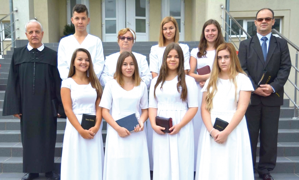 Miután a szívek megmozdultak, a víz is megmozdult a keresztelő medencében a szilágyperecseni gyülekezetben. 2017. szeptember 17-én alámerítésre került sor, amikor nyolc fehérruhás vallotta meg hitét, az Úr Jézus példáját követve. Az ünnepi istentiszteleten igét hirdetett Raina Ottó, a tordai gyülekezet és körzet lelkipásztora a Jel 2:36-41 igék alapján, hangsúlyozva a szívbeli megtöretés fontosságát, ami a megtéréshez vezet. Az alámerítést Bálint Pál lelkipásztor végezte, majd kézrátétellel való imádságban kértünk áldást és vezettetést az új tagok életére. A délutáni istentiszteleten köszöntések hangzottak el, és az új tagok szolgáltak az Úrnak. Igét hirdetett ismét Rajna Ottó lelkipásztor az 1Móz 12:10-20 alapján. A képen balról jobbra, hátsó sor: Bálint Pál lelkipásztor, Józsa Krisztián, Orbán Magda, Józsa Viktória, Bákai Abigél, Rajna Ottó lelkipásztor. Első sor: Debre Antónia, Balla Bettina, Kulcsár Szintia, és Papp Emőke, aki a varsolci gyülekezet tagja lett. Az Úr megtartó kegyelme legyen az új tagok életén! [B. P.]